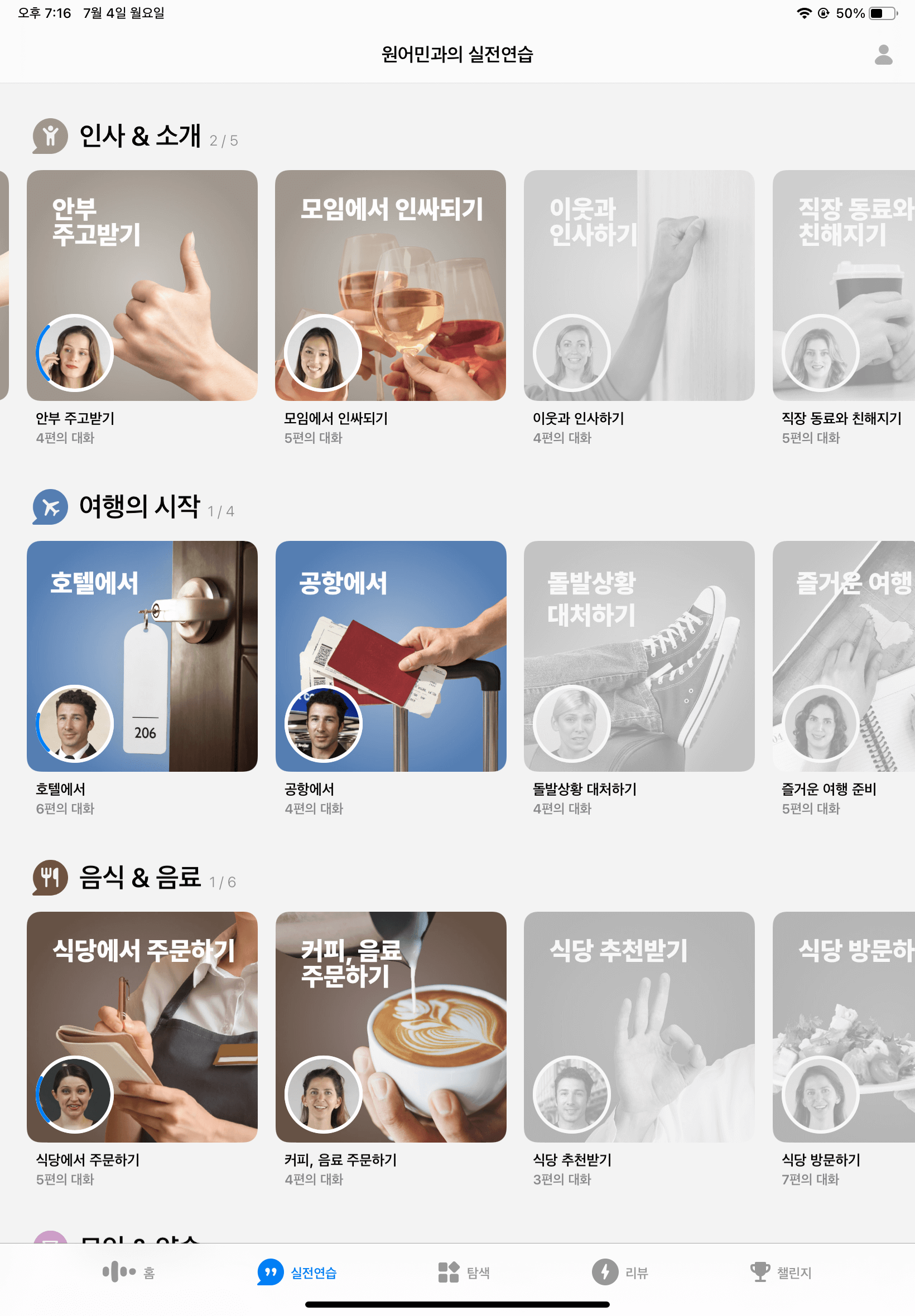 다 사용해보니 실전 연습도 좋고 탐색 탭도 좋아요. 실전은 원어민들과 좀 더 대면하는 느낌으로 연습하기 좋습니다.